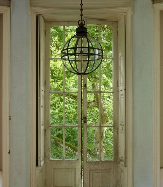 This spherical lantern, now made to grand scale, is crafted of hand-moulded copper and finished in bronze. The central meridian of simple form, comprising of a double band moulding. A simple ball finial rests on a circular banded cupola designed to reduce heat or smoke.