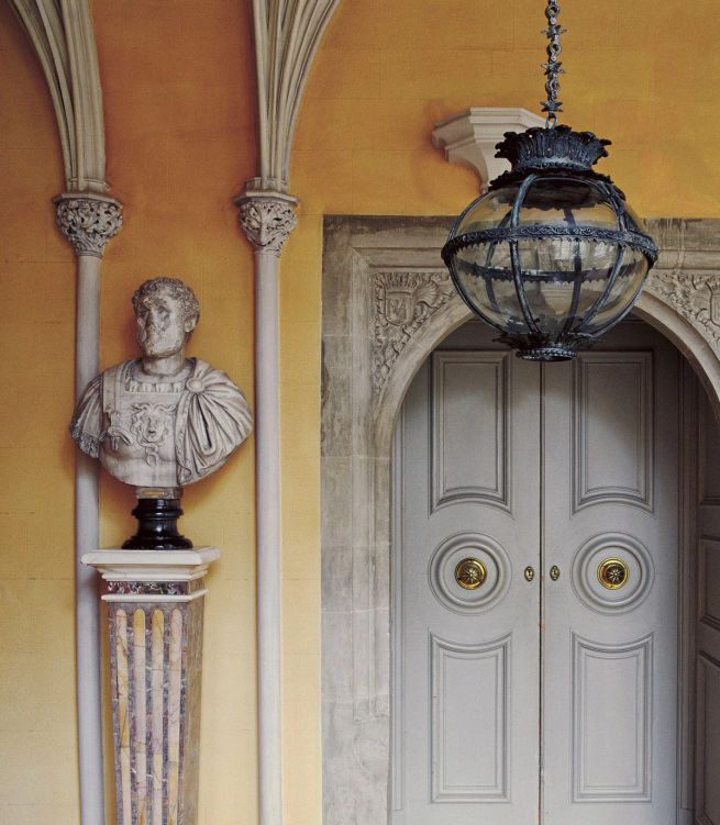 A bronze hanging lantern of squat circular form, with a central band decorated with flower heads and scrolling foliage. The top and bottom with bands of running pearl and acanthus decoration.