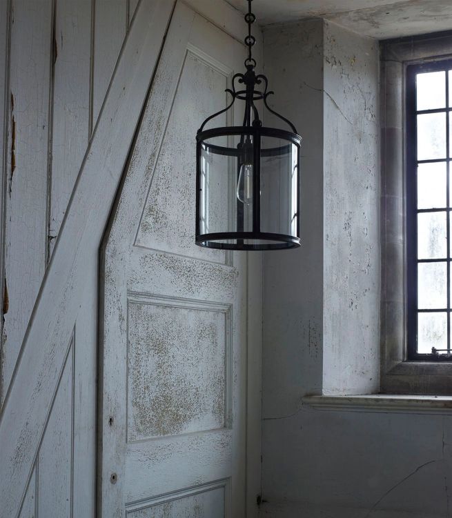 This classic cylindrical lantern comprises four panes of curved glass beneath a scrolling top. Its timeless design and smaller proportions render it a discreet yet handsome addition to an indoor or covered space.