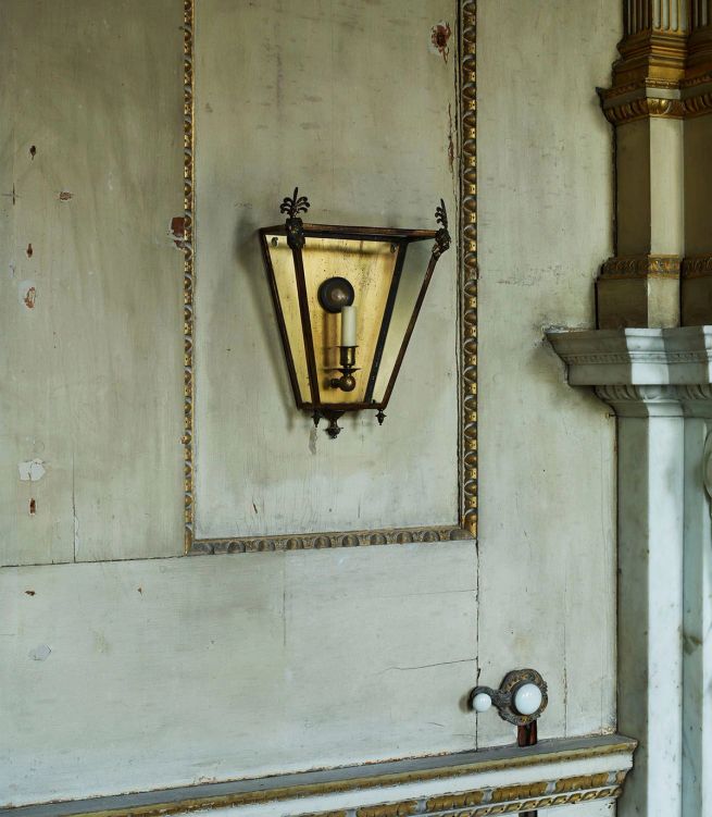 This elegant wall lantern has tapering sides the corners of which are surmounted by female Egyptian lions masks capped with anthemion fronds and the underneath is decorated with inverted finials.